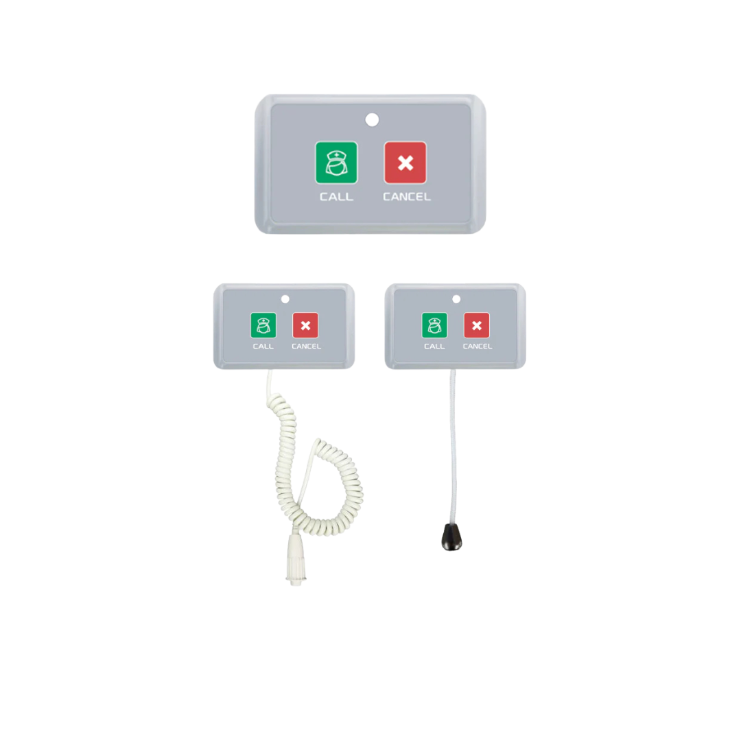 - Butoane de panică și apelare standard – montate pe perete sau la patul pacientului, disponibile în variante cu fir sau wireless, pentru transmiterea instantă a apelului către personalul medical.